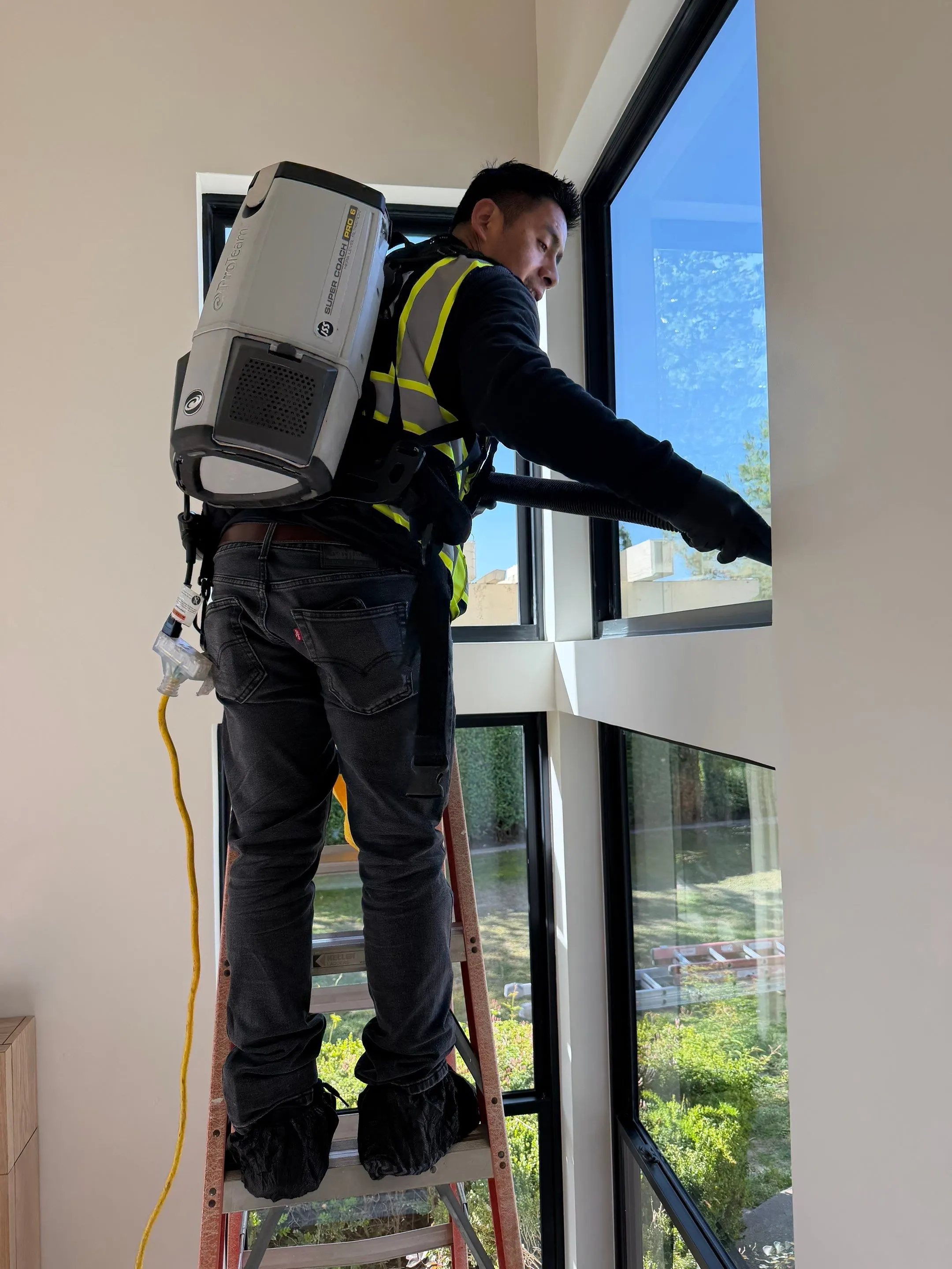 No. We clean post-construction dust and debris from finished spaces. Any hazardous material removal must be handled by licensed abatement professionals before we arrive.